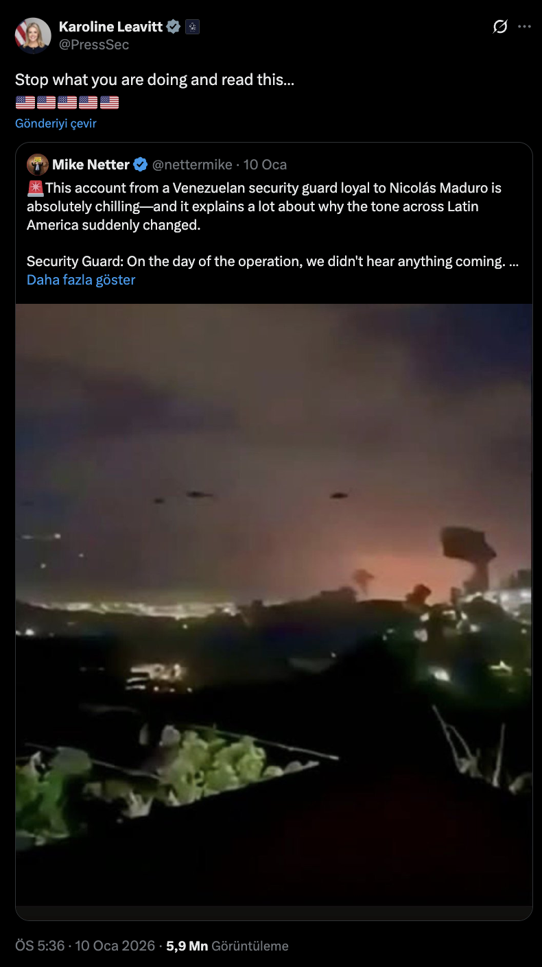 Mike Netter’ın, Latin Amerika genelinde tonun neden bir anda değiştiğini açıkladığını argüman ederek yaptığı paylaşım, ABD’nin Grönland ve İran telaffuzlarını sertleştirdiği bir periyotta açıkça ‘gözdağı’ verme emeliyle servis edildiği aşikar. Beyaz Saray sözcüsünün bunu açıkça yapamayıp, ortalama bir siyasi yorumcunun hesabını alıntılaması ve ballandırarak ‘okuyun’ demesi bu tezi güçlendirir nitelikte.