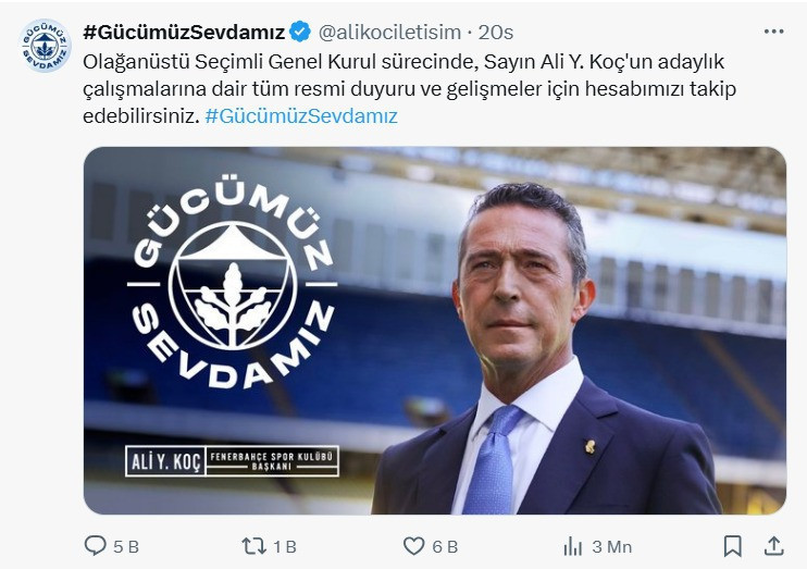 Mevcut lider Ali Koç da aday olabilmek için gerekli imzayı toplayarak tekrar aday olduğunu açıkladı. Lider Ali Koç’un yapılacak seçimli kongre öncesinde seçtiği ‘Gücümüz Sevdamız” sloganı Fenerbahçeli taraftarlar ortasında tartışma konusu haline geldi.