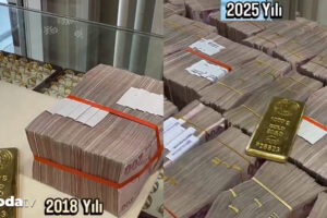 Paylaşılan görüntüde o periyotta bir deste 200 TL’lik banknotla satın alınabilen bir kilo altın, bugün onlarca deste 200 TL’ye denk geliyor. Toplumsal medyada paylaşılan manzaralarda, 2018’de bir deste ile alınan altının, 2025’te neredeyse masanın tamamını kaplayan banknot desteleriyle alınabildiği görülüyor.
