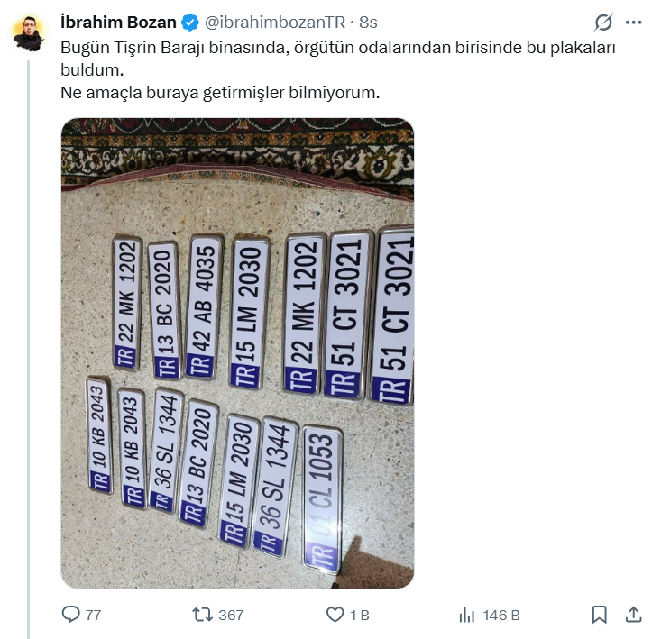 Öte yandan, gazeteci İbrahim Bozan, PKK’nın boşaltıp, Suriye ordusunun geri aldığı Tişrin Barajı binasında, Türkiye Cumhuriyeti’ne ilişkin plakalar bulduğunu duyurdu. Plakaların örgüt mensuplarının Türkiye ve Suriye’de kullanılmak üzere çaldığı ya da ürettiği kestirim ediliyor.
