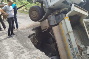 Artvin’de yol aniden çöktü, kamyon çukura düştü