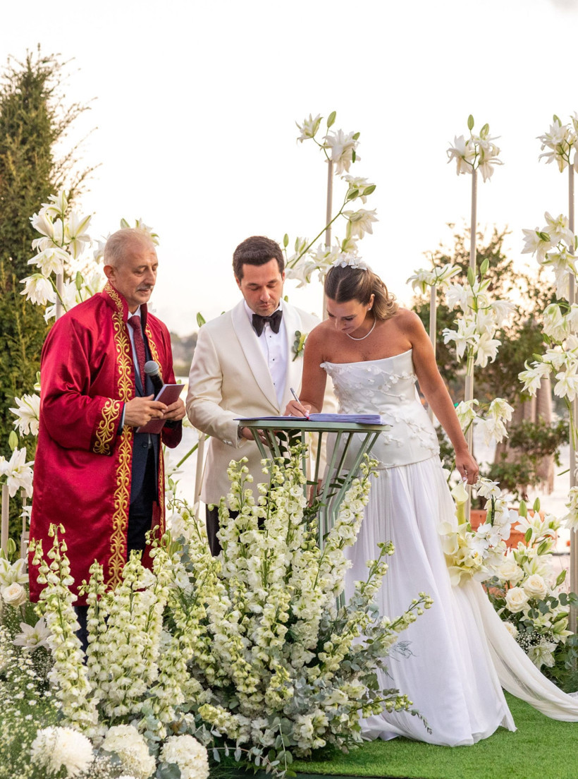 Düğünde bordo ve gümüş tonları ile kuğu beyazı yer aldı. Düğün, Paris’in ünlü kabare kültürünü yansıtan Moulin Rouge esintileriyle bütünleşti.