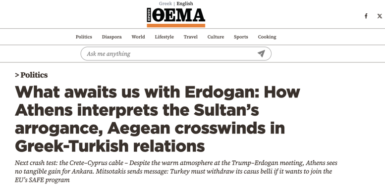 Yunanistan’ın ana akım gazetelerinden Protothema, Erdoğan’ın Washington temaslarını aktarırken küstah bir lisan kullandı: Haberin başlığında “Sultanın kibri” tabirine yer verilirken Atina, Trump’ın Erdoğan’a övgüler yağdırmasına karşın Türkiye’nin hiçbir somut kazanım elde etmediğini tez etti.