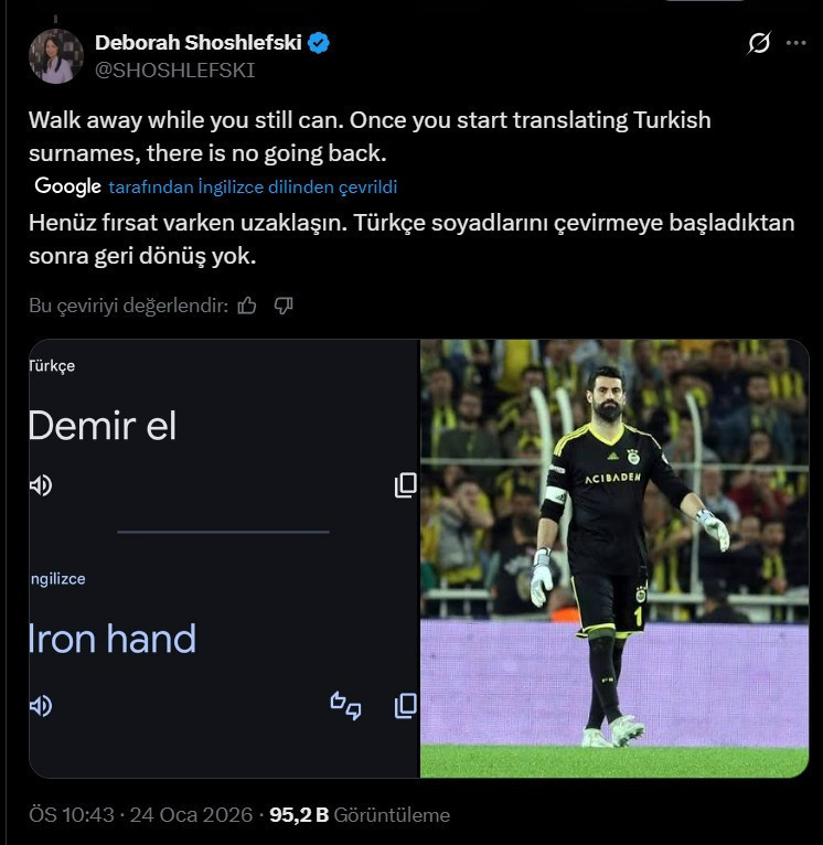 Bir öteki kullanıcı, eski ulusal kaleci Volkan Demirel’in soyadını “Iron Hand” biçiminde İngilizce’ye çevirdiği ekran imgesini paylaşarak “Henüz fırsat varken uzaklaşın. Türkçe soyadlarını çevirmeye başladıktan sonra geri dönüş yok” tabirlerini kullandı.