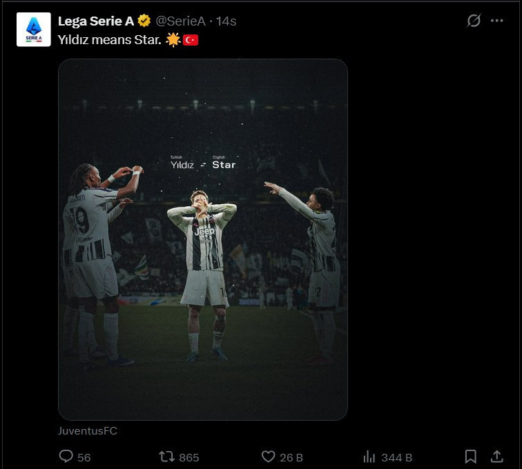 İtalya Serie A’nın resmi toplumsal medya hesabı da akıma katılarak, “Yıldız, ‘star’ demektir” sözlerini kullandığı bir paylaşım yaptı.