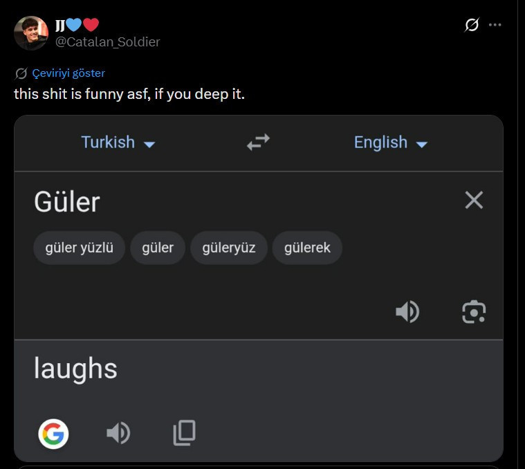 İspanyol toplumsal medyasında da Kenan Yıldız ile başlayarak süratle yayılan akım Arda Güler’e de uyarlandı. Bir diğer kullanıcı Arda Güler’in soyadını “laughs” olarak çevirdiği ekran fotoğrafını paylaştı.