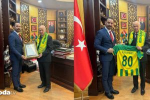 Osmaniyespor Kulübü Lideri Mahmut Altay Kobaner ziyarette MHP lideri Devlet Bahçeli’ye “Onursal Başkanlık Belgesi”nin yanı sıra kadronun forma ve atkısını takdim etti. Bahçeli, Osmaniyespor forması giyerek hatıra fotoğrafı çektirdi.