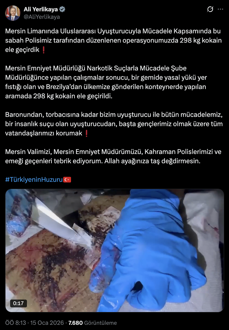İçişleri Bakanı Ali Yerlikaya, sosyal medya platformu X üzerinden yaptığı açıklamada Mersin Limanı’nda düzenlenen uyuşturucu operasyonunun ayrıntılarını paylaştı. 298 kg kokainin ele geçirildiğini belirten Bakan Yerlikaya şu ifadeleri kullandı: