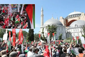 Göstericiler İstanbul’un Eminönü ilçesinde bulunan Ayasofya Camii ve Ankara’daki Melike Hatun Camii önünde toplandı.