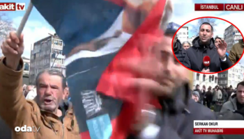 İBB Başkanı Ekrem İmamoğlu’nun gözaltına alınmasını protesto etmek için toplanan vatandaşlar, Akit TV’nin yaptığı canlı yayını protesto etti. Akit TV muhabirinin Atatürklü Türk bayrağını yere attığı anlar reaksiyon çekti.