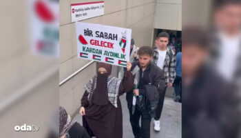 İstanbul’da bir bayan, İsrail’in Gazze’ye müdahalesini protesto için Uzunçayır’da sessizce pankart taşıdı.