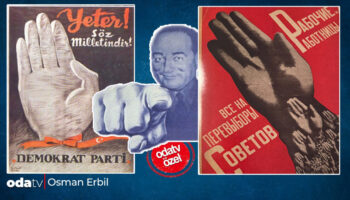 İki el figürü var: Birincisi, Demokrat Parti’nin meşhur ‘Yeter Kelam Milletindir’ afişinden… İkincisi, Soyvetler’in 1931 yılında personelleri seçime çağırdığı görselden… Afişler, tek farkla birbirinin birebiri…