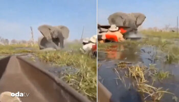 Bir fil, Afrika’ya turistik seyahat düzenleyen İngiliz çiftin kanosunu devirerek, ikiliyi ezmeye çalıştı. Olay, görgü şahidi tarafından kayıt altına alındı.