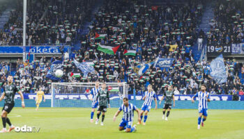 İspanya LaLiga 8. hafta maçında, Alaves ile Elche ekipleri Vitoria-Gasteiz kentindeki Mendizorrotza Stadı’nda karşı karşıya geldi. Alaves ekibinin taraftarları Filistin’e için pankart açtı.