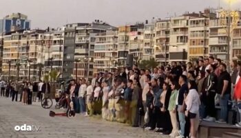İzmir Kordon’da, küçük bir çocuğun İstiklal Marşı’nı okuması üzerine, oturan vatandaşlar ayağa kalkarak hürmet duruşuna geçti.