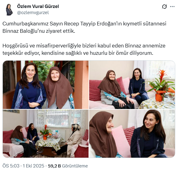“Cumhurbaşkanımız Sayın Recep Tayyip Erdoğan’ın değerli sütannesi Binnaz Baloğlu’nu ziyaret ettik. Müsamahası ve misafirperverliğiyle bizleri kabul eden Binnaz annemize teşekkür ediyor, kendisine sağlıklı ve huzurlu bir ömür diliyorum”