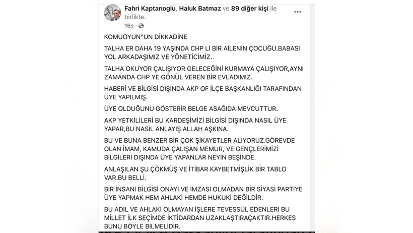 Geçtiğimiz hafta Çorum’daki argümanlara benzeri bir açıklama da Trabzon’dan gelmişti. CHP Of İlçe Başkanı Fahri Kaptanoğlu, 19 yaşındaki Talha Er’in bilgisi dışında AKP’ye üye yapıldığını öne sürdü. Kaptanoğlu, gencin babasının CHP yöneticisi olduğunu belirterek, bu tıp şikâyetlerin kendilerine sıkça ulaştığını söz etti. Bilgisi, onayı ve imzası olmadan yapılan üyeliklerin hem ahlaki hem de tüzel olmadığını savunan Kaptanoğlu, duruma sert reaksiyon gösterdi.