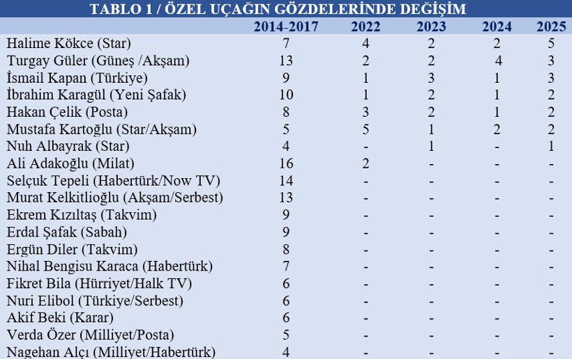 Medya Ombudsmanı Faruk Bildirici, ferdî internet sitesinde yayımladığı yazısında, daha evvel “aynı isimlerin davet edilmesi” ve “soruların evvelce belirlendiği” münasebetleriyle sıkça eleştirilen Cumhurbaşkanlığı uçağında yer alan gazetecileri mercek altına aldı. Bildirici, 2025 yılı için “gözde” ve “gözden düşen” isimleri belirlerken, davet edilen gazetecilerin listesini evvelki yıllarla da karşılaştırdı.