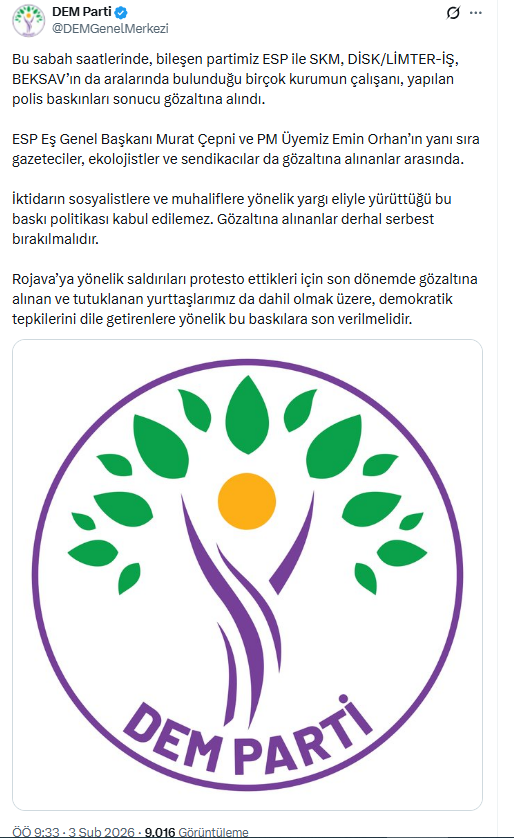 “Bu sabah saatlerinde, bileşen partimiz ESP ile SKM, DİSK/LİMTER-İŞ, BEKSAV’ın da ortalarında bulunduğu birçok kurumun çalışanı, yapılan polis baskınları sonucu gözaltına alındı. ESP Eş Genel Başkanı Murat Çepni ve PM Üyemiz Emin Orhan’ın yanı sıra gazeteciler, ekolojistler ve sendikacılar da gözaltına alınanlar ortasında. İktidarın sosyalistlere ve muhaliflere yönelik yargı eliyle yürüttüğü bu baskı siyaseti kabul edilemez. Gözaltına alınanlar derhal hür bırakılmalıdır. Rojava’ya yönelik atakları protesto ettikleri için son periyotta gözaltına alınan ve tutuklanan yurttaşlarımız da dahil olmak üzere, demokratik reaksiyonlarını lisana getirenlere yönelik bu baskılara son verilmelidir.”