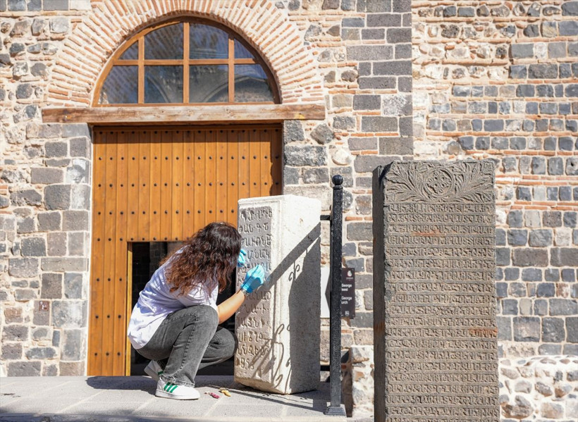 Müze bahçesindeki 1800 yıllık Saint George Kilisesi önüne bırakılan mezar kapağı, arkeolog, restoratör, antropolog ve sanat tarihçilerinden oluşan takım tarafından ince bir çalışmayla temizlenecek ve incelenecek.