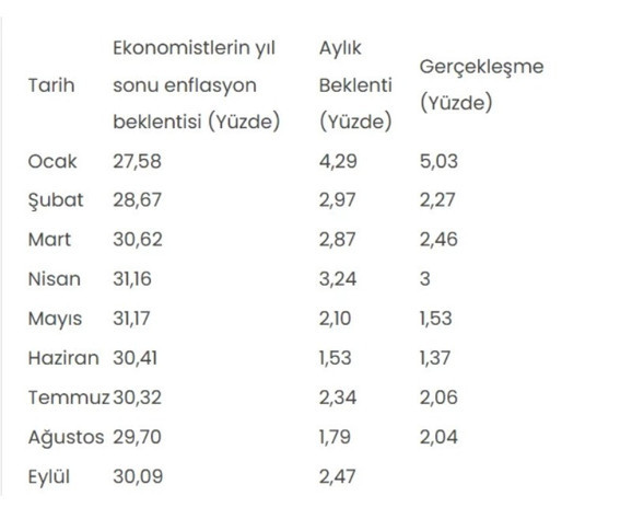 Öte yandan, ekonomistlerin 2025 sonu enflasyon beklentisi eylül ayı prestijiyle yüzde 30,09 oldu. Ekonomistlerin yıl sonu için enflasyon beklentileri yüzde 29,20 ile yüzde 32,54 aralığında yer aldı.