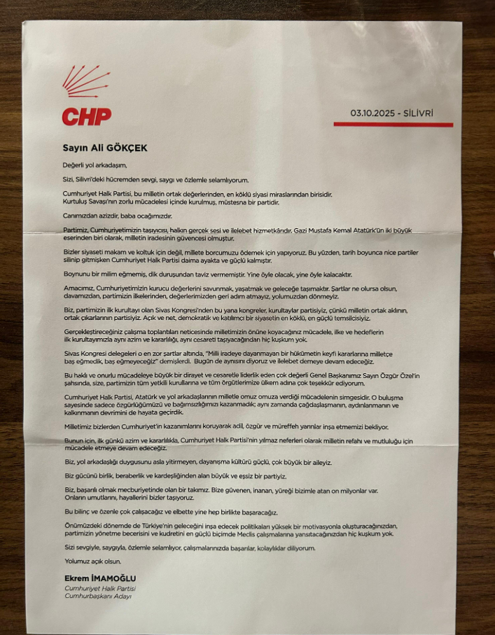 İstanbul Büyükşehir Belediyesi’ne yönelik soruşturma kapsamında 23 Mart’ta tutuklanan CHP’nin cumhurbaşkanı adayı ve İBB Başkanı Ekrem İmamoğlu, kampa katılan milletvekillerine bir mektup gönderdi. Halk TV’de yer alan habere nazaran CHP’li vekillere dağıtılan İmamoğlu’nun mektubunda şu sözler yer aldı: