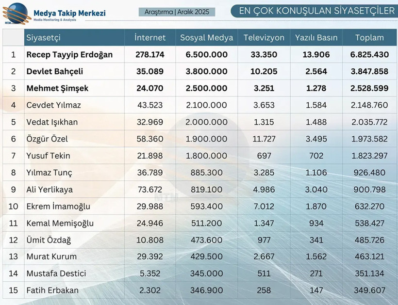 Medya Takip Merkezi, 2025 yılının aralık ayında en çok konuşulan siyasetçileri sıraladı. Raporda, en çok konuşulan siyasetçiler ortasında, Cumhurbaşkanı Recep Tayyip Erdoğan birinci sırada yer alırken CHP Genel Başkanı Özgür Özel, ilk beşte yer bulamadı.