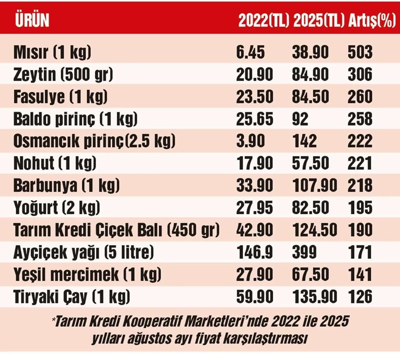Cumhurbaşkanı Recep Tayyip Erdoğan’ın “Fiyatlar noktasında pek uygun” dediği Tarım Kredi Kooperatifleri Marketleri de alternatif olamadı. Müşterilerinin çoğunluğu orta üstü yaş kümesinden oluşan bu marketlerde etiketlere enflasyonun üzerinde artırım yapıldı. 2022 ile 2025 Ağustos ayı fiyatları karşılaştırıldığında birçok eserde 3 kata varan fiyat artışları görülüyor. Temel besinlerin yer aldığı 16 eserlik sepetin toplam maliyeti 2022’de 637.5 TL olurken, tıpkı sepet için 2025’te 1.774 TL ödemek gerekiyor.