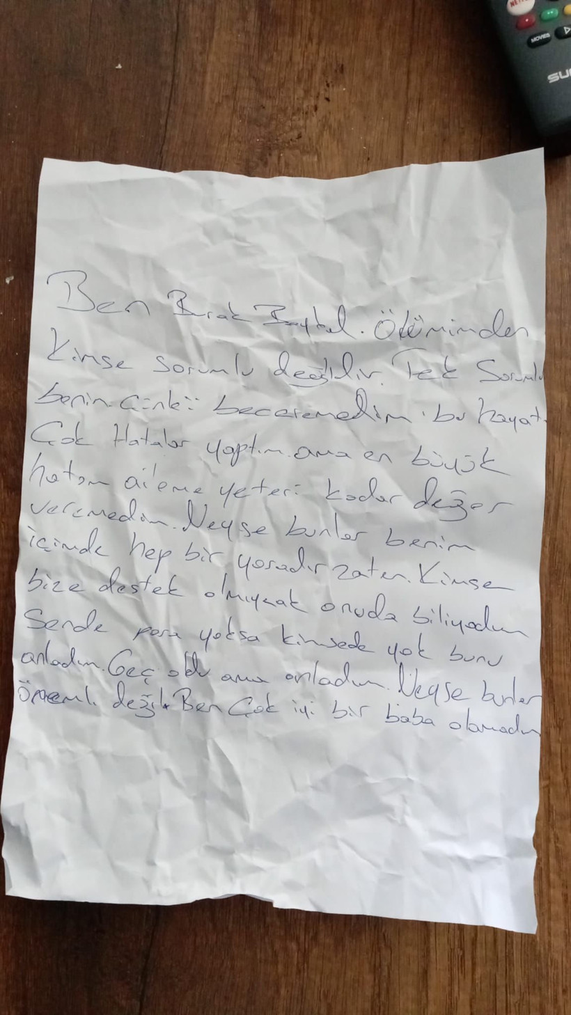 “Ben Burak Baykal. Vefatımdan kimse sorumlu değildir. Tek sorumlu benim zira beceremedim bu hayatı. Çok yanlışlar yaptım fakat en büyük yanlışım aileme yeteri kadar paha vermedim. Neyse bunlar benim içimde daima bir yaradır esasen. Kimse bize dayanak olmayacak, onu da biliyordum. Sende para yoksa kimsede yok bunu anladım. Geç oldu ancak anladım. Her şey bunlar kıymetli değil. Ben çok âlâ bir baba olamadım”