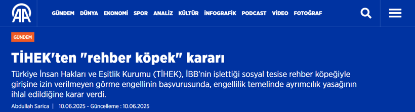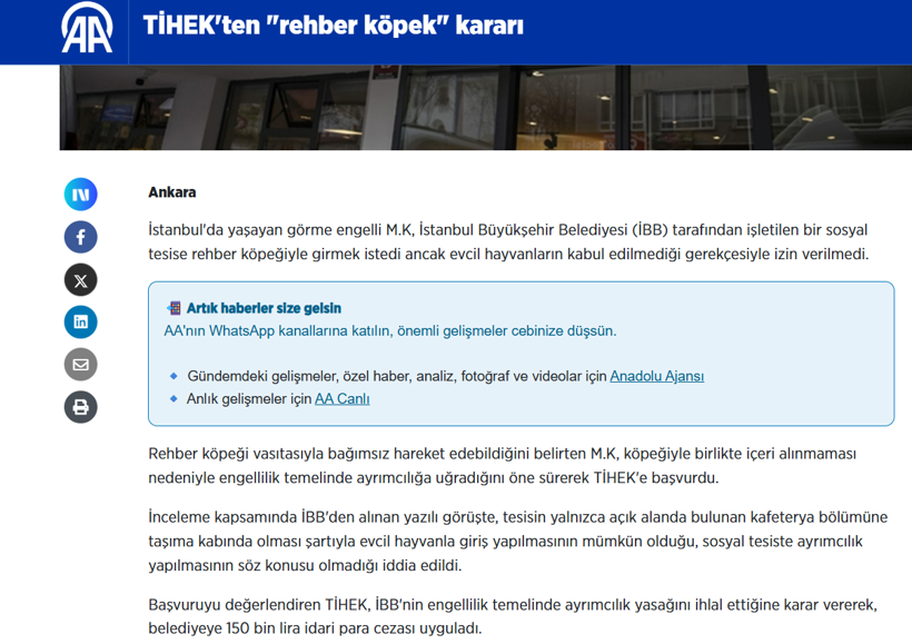 Vatandaşta bunun üzerine rehber köpeğinin kabul edilmemesi nedeniyle TİHEK’e başvurdu. Başvuruyu kıymetlendiren TİHEK, İBB’nin engellilik temelinde ayrımcılık yasağını ihlal ettiğine karar vererek, belediyeye 150 bin lira idari para cezası uyguladı.