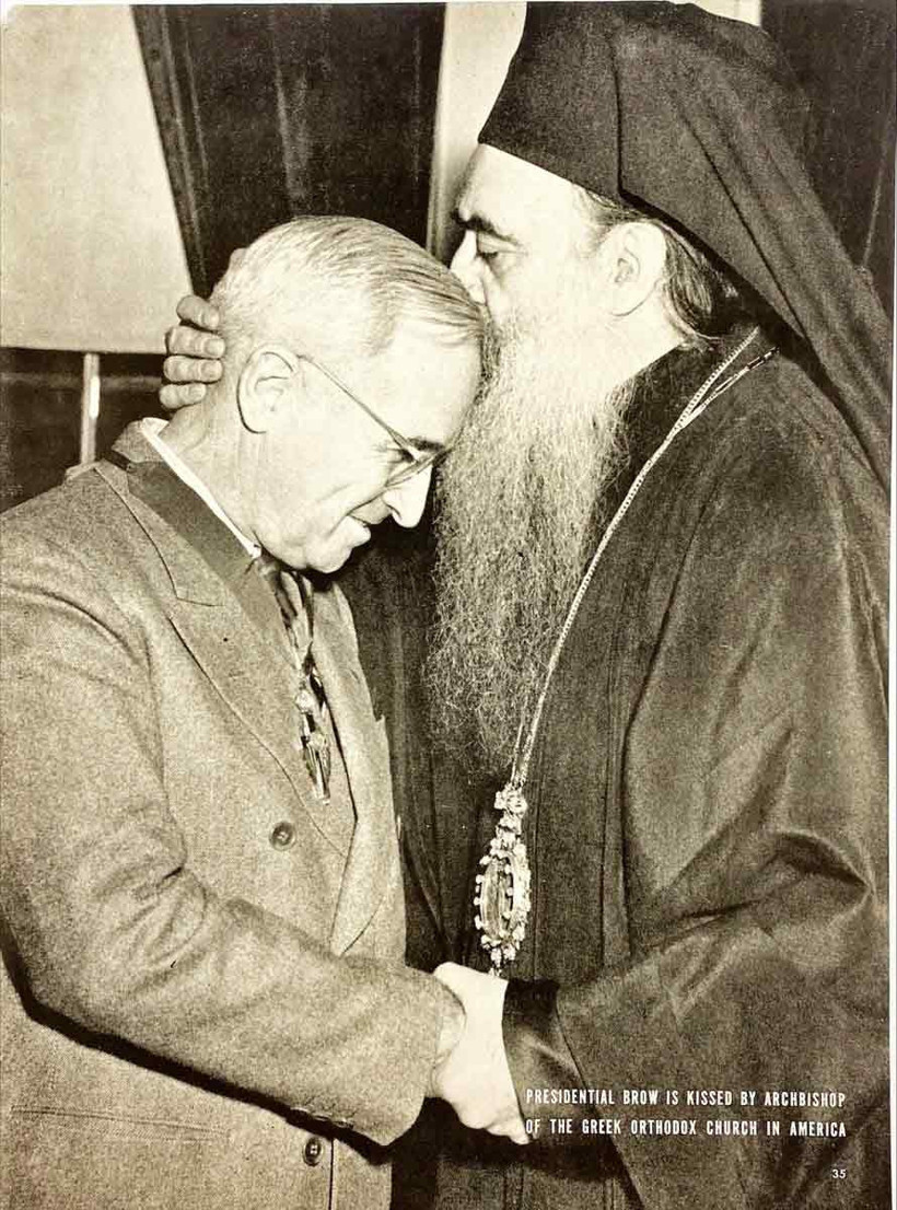 Ocak 1947’de Athenagoras, dönemin ABD Başkanı Harry Truman ve birkaç kıymetli Yunan yetkiliyle özel, kayıt dışı bir toplantı yaptı. Üç hafta sonra Athenagoras, Truman’a “Gerçek Haç”tan bir kesim verdi ve bu, Athenagoras’ın Truman’ın başını öptüğü ünlü bir fotoğrafın ortaya çıkmasına yol açtı.