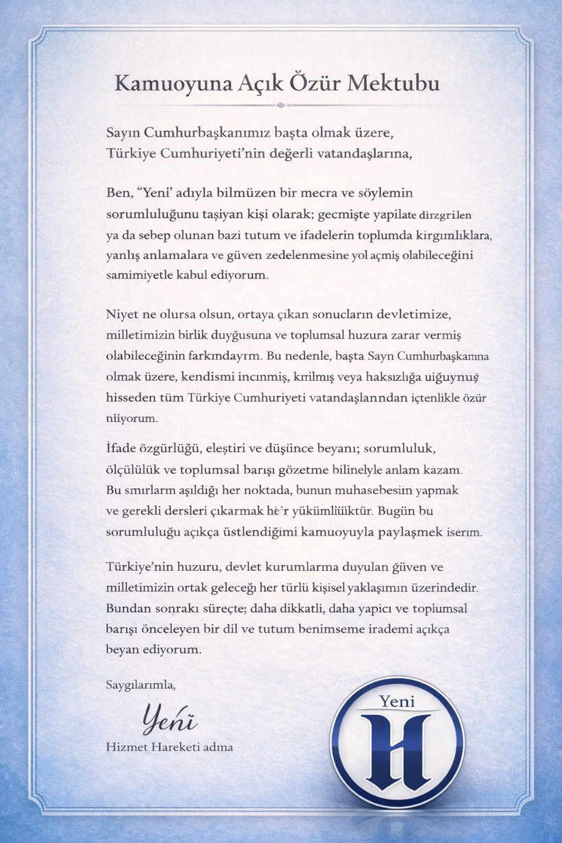 Mehmet E. San isimli hesap tarafından paylaşılan iki mektubun birincisinde, “Ben, ‘Yeni’ ismiyle bir mecra ve telaffuzun sorumluluğunu taşıyan kişi olarak; geçmişte sebep olunan kimi tavır ve sözlerin toplumda kırgınlıklara, yanlış anlamalara ve inanç zedelenmesine yol açmış olabileceğini içtenlikle kabul ediyorum” tabirleri yer aldı.