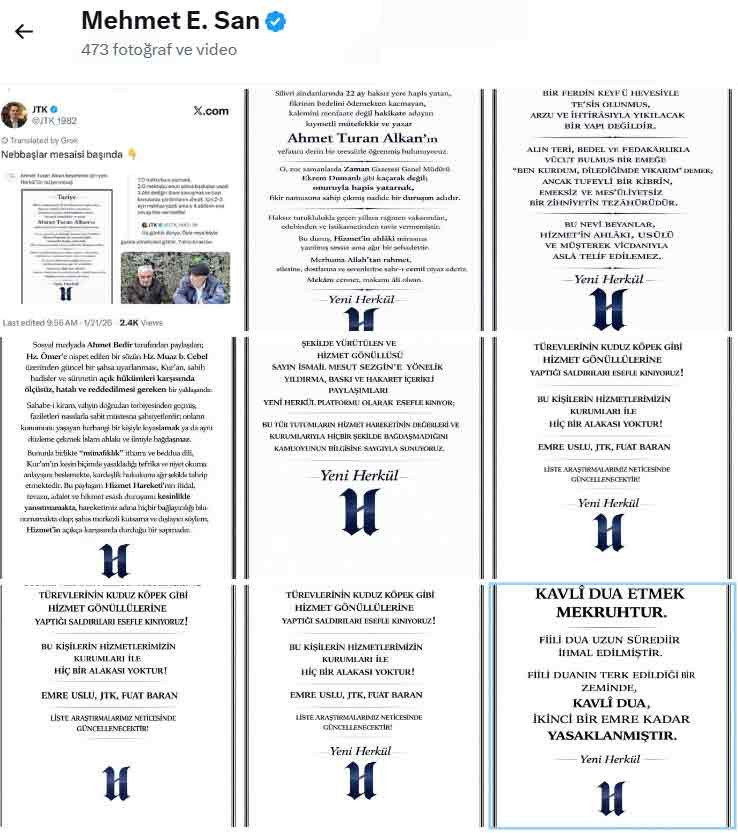 Yeni Herkül ismine iletileri paylaşan Mehmet E. San’ın kimliği merak uyandırdı. Müstear isim kullandığı kestirim edilen ve X’te sohbet odalarına katılan Mehmet San’ın, firari FETÖ’cü gazeteci Ahmet Dönmez ile birlikte hareket ettiği düşünülüyor. Sık sık “örgüt içi hesaplaşma” davetleri yapan Ahmet Dönmez, “örgütün Türkiye Cumhuriyeti tarafından affedilmesi” gerektiğini savunan yazılar yazıyor ve yayınlar yapıyor. Dönmez’in, Ekrem Dumanlı, Cevdet Türkyolu ve Mustafa Özcan üzere örgütün “ABD kanadını” temsil eden üst seviye FETÖ’cülere yönelik sert tenkitleri biliniyor. Yeni Herkül’ün de amacında Ekrem Dumanlı’nın olması bu tezi doğruluyor.