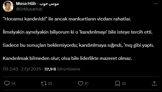 “Hocamız kandırıldı!’ ile lakin mankurtların vicdanı rahatlar. İlmelyakin aynelyakin biliyorum ki o ‘kandırılmayı’ bile isteye tercih etti. Yalnızca bu sonuçları beklemiyordu; kandırılmaya sığındı, ‘mış üzere yaptı. Kandırılmak bilmeden olur; olsa bile liderlikte mazeret olmaz”