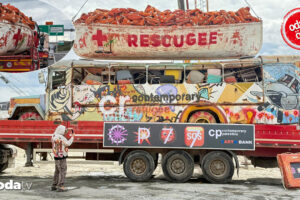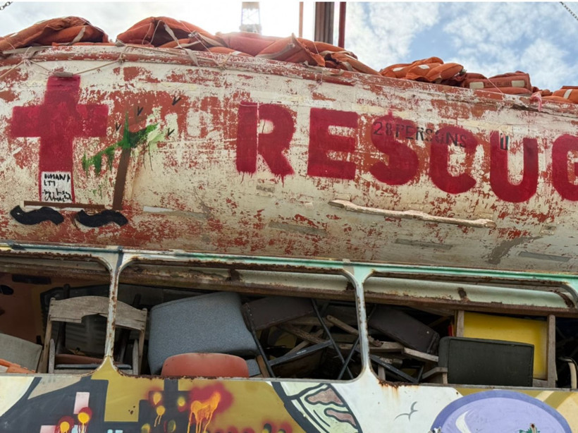 Üstteki kurtarma botunda, “rescue” (kurtarma) ile refugee (mülteci) sözlerinin birleşimiyle “rescugee” yazıyor. Bununla, başta Yunanistan olmak üzere Avrupa ülkelerinin Ege ve Akdeniz’de batırdığı mülteci botlarında kayıp giden hayatlar hatırlatılıyor.