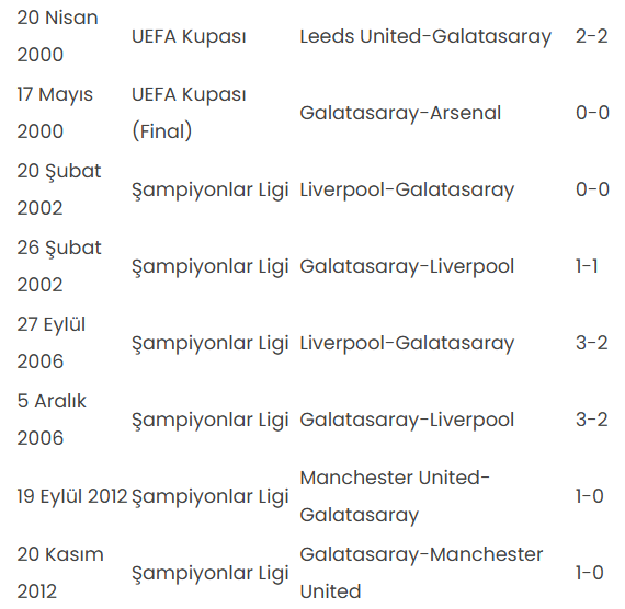 Galatasaray, İngiliz rakiplerinden Liverpool ve Chelsea ile dörder, Arsenal ile 3, West Bromwich Albion ve Leeds United ile ikişer kere karşılaştı.