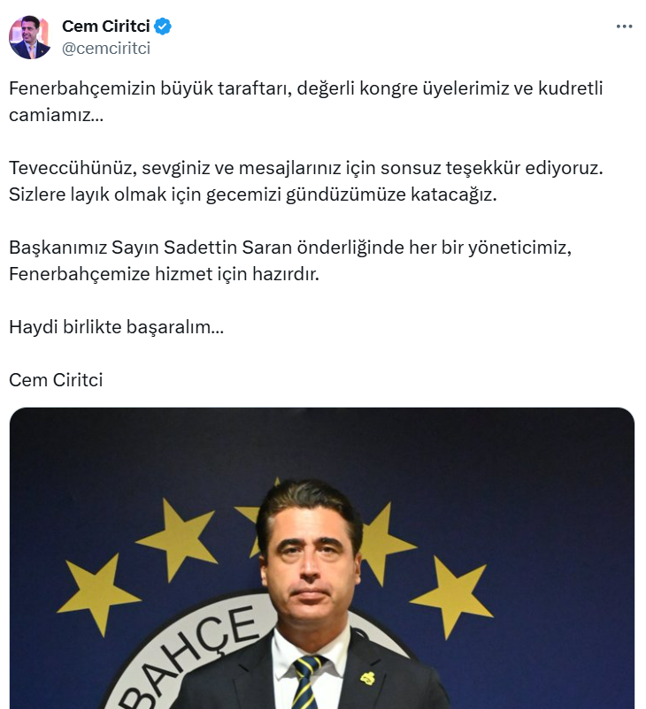 Gelişmeyi X hesabından duyuran Cirtici, “Fenerbahçemizin büyük taraftarı, bedelli kongre üyelerimiz ve kudretli camiamız… Teveccühünüz, sevginiz ve iletileriniz için sonsuz teşekkür ediyoruz. Sizlere layık olmak için gecemizi gündüzümüze katacağız. Liderimiz Sayın Sadettin Saran önderliğinde her bir yöneticimiz, Fenerbahçemize hizmet için hazırdır. Haydi birlikte başaralım…” dedi.