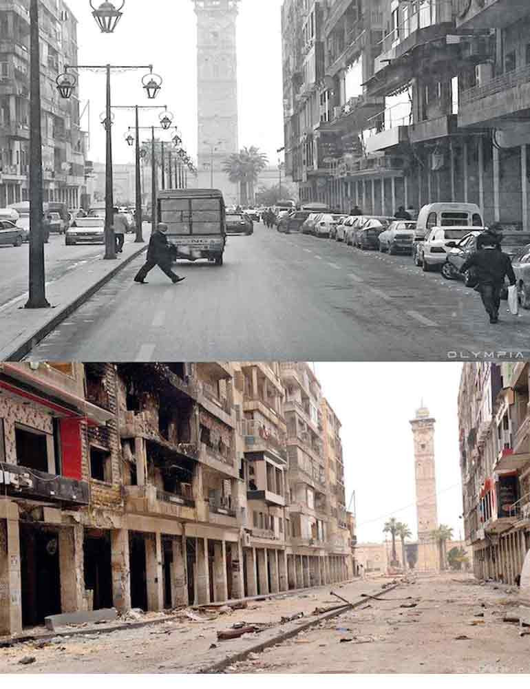 Halep’te çatışmaların durmasının akabinde kentten gelen manzaralar, Mimar Sinan’ın yapıtlarının de ağır hasar gördüğünü ortaya koydu. Halep Kalesi’nin çabucak altında yer alan ve Halep Valisi Hüsrev Paşa tarafından yaptırılan Hüsreviye Camii ve Külliyesinin, savaşın yıkımıyla büyük ölçüde harap olduğu görüldü. Yasal Sultan Süleyman devrinde Sinan’ın imzasını taşıyan yapı kompleksinin eski fotoğraflarındaki görkemli siluetin yerini, bugün enkaz ve tahribat aldı.