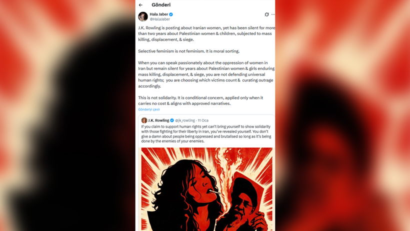 “JK Rowling İranlı bayanlar hakkında paylaşımlar yapıyor, fakat iki yıldan fazla bir müddettir toplu katliamlara, yerinden edilmeye ve kuşatmaya maruz kalan Filistinli bayanlar ve çocuklar hakkında sessiz kalıyor. Seçici feminizm, feminizm değildir. Bu, ahlaki sınıflandırmadır. İran’daki bayanlara yönelik baskı hakkında tutkuyla konuşabiliyorken, Filistinli bayanların ve kız çocuklarının kitlesel katliamlara, yerinden edilmelere ve kuşatmalara maruz kalması konusunda yıllarca sessiz kalıyorsanız, kozmik insan haklarını savunmuyorsunuz; hangi kurbanların değerli olduğunu seçiyor ve buna nazaran öfke yaratıyorsunuz. Bu dayanışma değil. Bu, lakin hiçbir maliyeti olmadığında ve onaylanmış anlatılarla örtüştüğünde uygulanan şartlı bir ilgidir.”