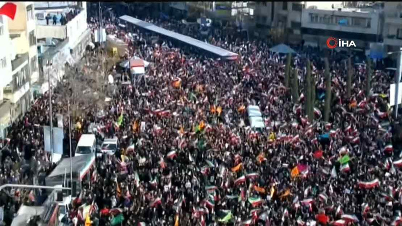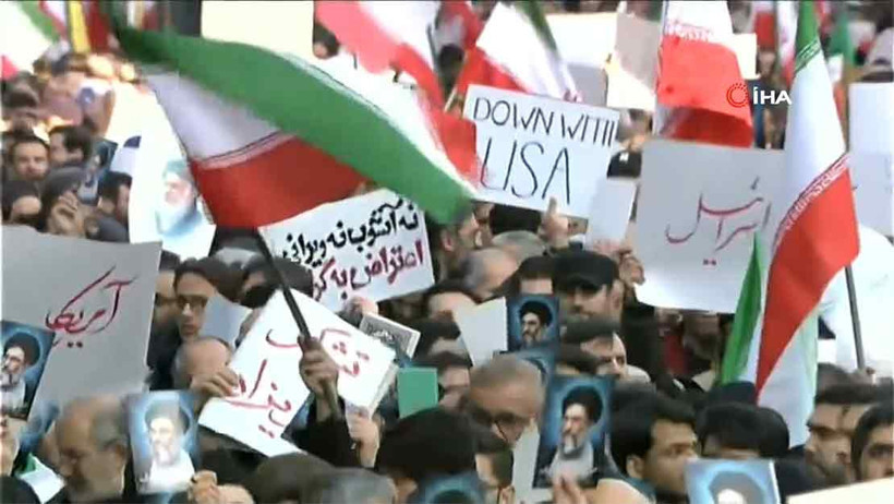 Başkent Tahran’da Enghelab Meydanı’na hakikat yürüyüşe geçen ve İran dini lideri Ali Hamaney’in posteri ve İran bayrakları taşıyan rejim yanlıları “Amerika’ya ölüm!” ve “İsrail’e ölüm!” sloganları attı.