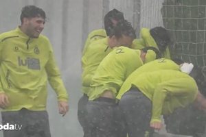 Futbolcular hem yağmur hem rüzgarın tesiriyle sırılsıklam hale gelirken hava şartları sebebiyle antrenman yarım bırakılmak zorunda kaldı. O anlar kulübün toplumsal medya hesabından “Bugün pek tiki-taka yapacak durum yok” sözleriyle paylaşıldı.