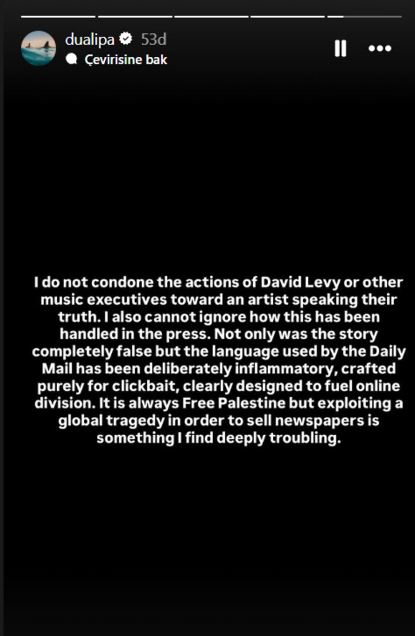 “David Levy yahut öbür müzik yöneticilerinin, gerçeği lisana getiren bir sanatkara yönelik hareketlerini onaylamıyorum. Basının bunu nasıl ele aldığını da görmezden gelemiyorum. Haber büsbütün yanlış olmakla kalmıyor, Daily Mail’in kullandığı anlatı da kasıtlı olarak kışkırtıcı, sırf tıklama almak için uydurulmuş ve açıkça internette fikir ayrılığı yaratmayı amaçlıyor.