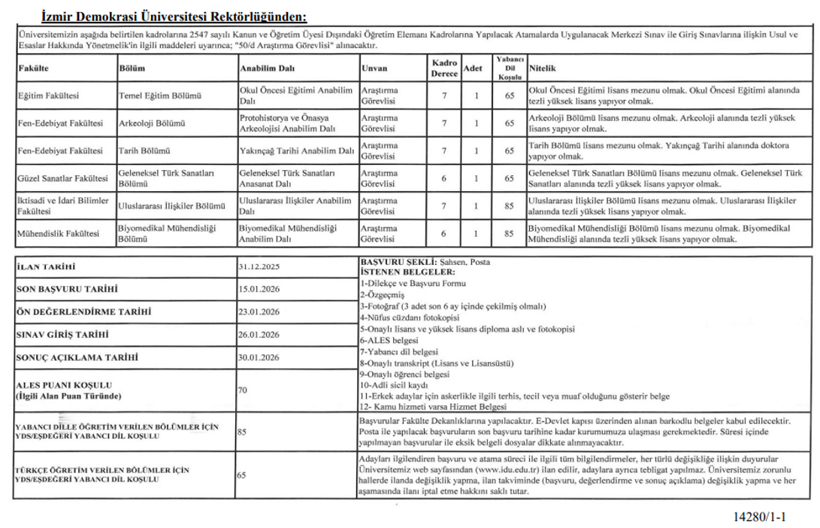 31 Aralık 2025 yılının son günü resmi gazetede Demokrasi Üniversitesi için yer alan ilanda takımı Katip Çelebi Üniversitesinde olan Demokrasi Üniversitesine görevlendirmeyle gelen Mikail Acıpınar’a “özel” olarak çıktığı tez ediliyor. İlanda “Fen -Edebiyat Fakültesi Tarih Kısmı Yakınçağ Anabilim Kolu Doçentliğini Yakınçağ Tarihi alanında almış olmak. Genç Periyot Osmanlı’nın sosyoekonomik ve demografik yapısını üzerine çalışmaları olmak” tarifinin Acıpınar’ın kısmıyla birebir örtüştüğü görülüyor.