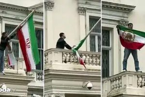 İngiltere’nin başşehri Londra’da İran Büyükelçiliği önünde düzenlenen rejim aksisi protesto sırasında bir aksiyoncu binanın balkonuna çıkarak İran bayrağını indirdi.