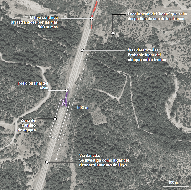 Çarpışma sonrası Iryo treni yaklaşık 500 metre denetimsiz biçimde kaydı. Üst elektrik çizgilerinin devrilmesiyle hatta elektrik kesildi. Alvia treninde ise kimi vagonlar rayda kalırken, birinci vagonların setten aşağı yuvarlandığı ve ağır hasar aldığı bildirildi.
