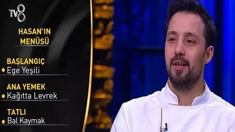 Hasan, imza menüsünde başlangıçta Ege Yeşili, ana yemekte Kağıtta Levrek, tatlıda ise Bal Kaymak hazırladı. Bu menüyle heyet üyelerinden toplam 20,5 puan aldı.