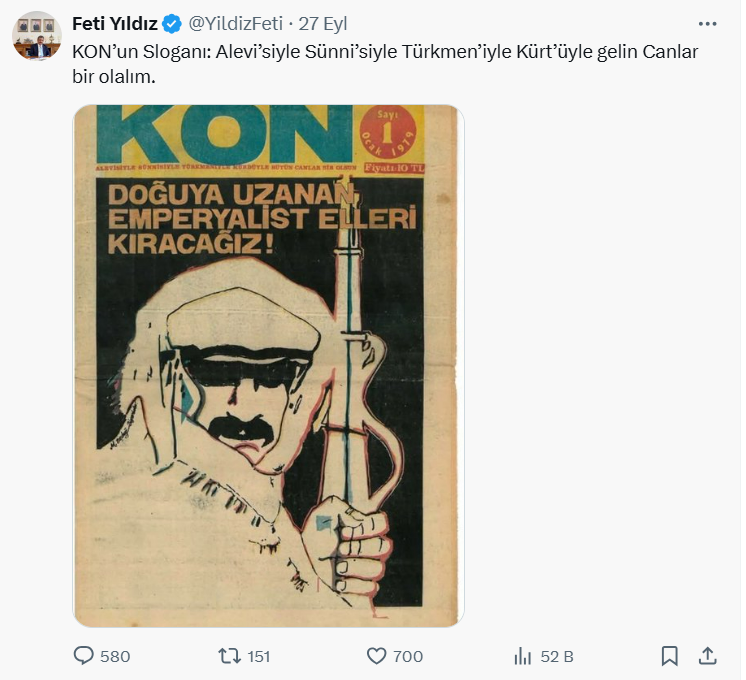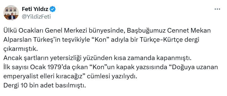 X hesabından yaptığı paylaşımda, “Ülkü Ocakları Genel Merkezi bünyesinde, başbuğumuz cennet yer Alparslan Türkeş’in teşvikiyle ‘Kon’ ismiyle bir Türkçe-Kürtçe mecmua çıkarmıştık. Lakin kuralların yetersizliği yüzünden kısa vakitte kapanmıştı. Birinci sayısı Ocak 1979’da çıkan “Kon”un kapak yazsısında “Doğuya uzanan emperyalist elleri kıracağız” cümlesi yazılıydı. Mecmua 10 bin adet basılmıştı” notunu düştü.