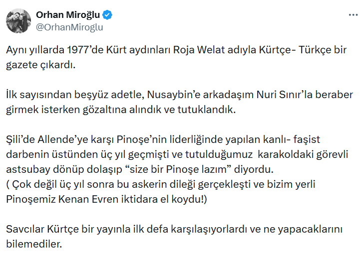 Yıldız’ın paylaşımını alıntılayan AKP’li Orhan Miroğlu, birebir devirde çıkarılan Türkçe-Kürtçe gazete “Roja Welat”ı anımsattı.