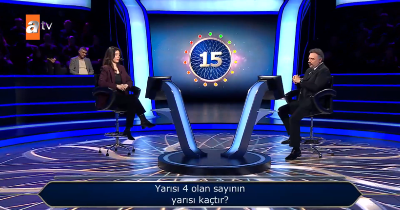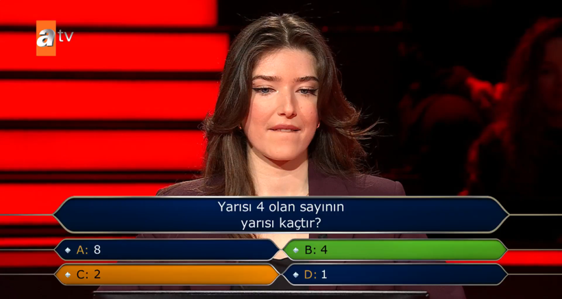 Oktay Kaynarca’nın sunduğu Atv’deki Kim Milyoner Olmak İster programında, Selin Kuranoğulları’na birinci soru olarak “Yarısı 4 olan sayının yarısı kaçtır?” yöneltildi. Yarışmacı bu soruya “2” cevabını verdi. Karşılığın yanlış olması nedeniyle Kuranoğulları, yarıştan ödül kazanmadan elendi.