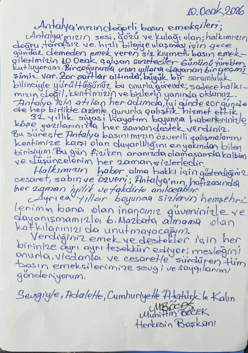 “Antalya’mızın bedelli basın işçileri, Antalya’mızın sesi, gözü ve kulağı olan; halkımızın hakikat, tarafsız ve süratli bilgiye ulaşması için gece-gündüz demeden emek veren siz değerli basın işçilerimizin 10 Ocak Çalışan Gazeteciler Günü’nü yürekten kutluyorum.